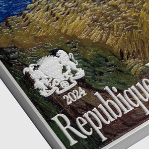 On a canvas of 165 x 125mm, a new minting technique called “Tri-Metal ” was applied to give this piece its remarkable weight while keeping its proportions true to the actual painting. This is made possible by combining 750g of Zinc as a center layer and 120g of copper as a base with a top layer of 2.5 oz of 999 fine Silver, resulting in a high relief. This is a limited edition of 399 pieces only. Each piece is packaged and delivered with a Certificate verifying its edition number and authenticity.