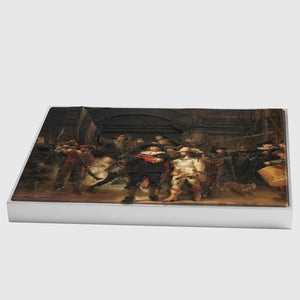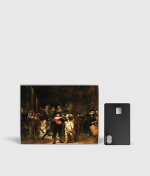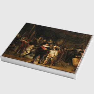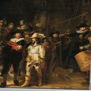 The painting depicts a company of Amsterdam’s civic militia—elite citizen-soldiers tasked with maintaining order in the city. At the centre of the canvas stands Captain Frans Bannick Cocq, dressed in striking black with a red sash, and his lieutenant, Willem van Ruytenburch, clad in yellow. Around them swirls a bustling scene: figures in mid-step, muskets raised or being loaded, a drummer rousing the troops, and a banner being unfurled. Unlike traditional militia portraits of the era, which often featured rows of stiff, formally posed men, Rembrandt breathes life into his subjects, transforming a group commission into a grand, almost cinematic moment of action.