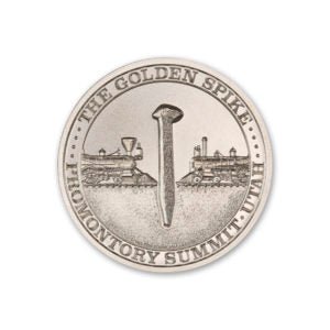 • Reverse: A depiction of opposing trains with the iconic golden spike driven into the ground between them.  “THE GOLDEN SPIKE” across the top circumference and “PROMONTORY SUMMIT” across the bottom, separated by bullet points.  The hallmark is just above, on the bottom circumference.